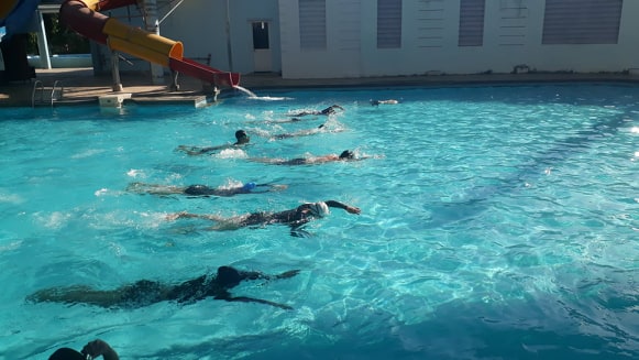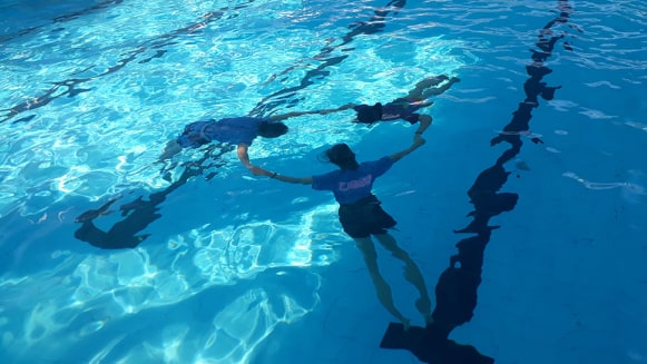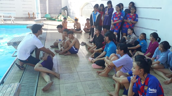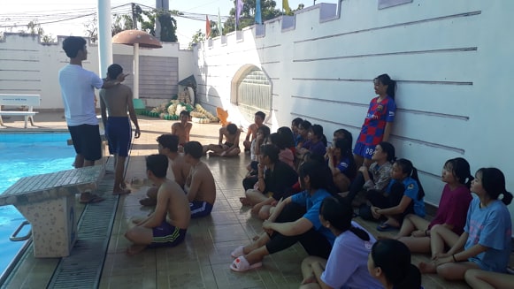 Sau những giờ thực hành để nâng cao kỹ năng, các em học sinh được vui chơi và trổ tài cùng nhau tại hồ bơi.