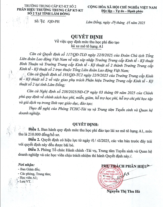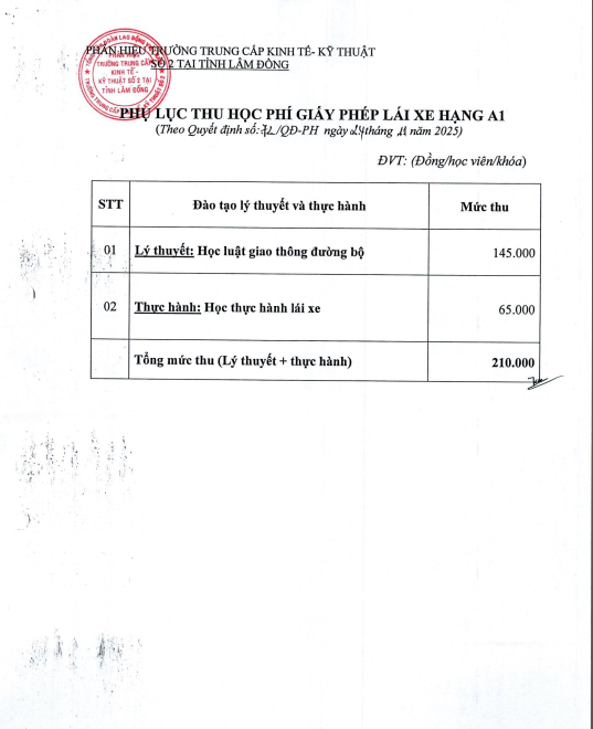 QUYẾT ĐỊNH VỀ MỨC THU HỌC PHÍ ĐÀO TẠO LÁI XE HẠNG A1 31/03/2026 8 lượt xem Trang chủ Đào tạo lái xe A1 Bài viết cùng chuyên mục QUY CHẾ TUYỂN SINH, TỔ CHỨC ĐÀO TẠO VÀ QUẢN LÝ ĐÀO TẠO LÁI XE HẠNG A1 Lịch học, thi sát hạch lái xe A1 Tháng 11/2024 Lịch học và thi lái xe A1 tại Phan Thiết tháng 5/2024 Thông báo: Đã có giấy phép lái xe hạng A1 khóa thi ngày 27/01/2024. Mời các anh chị học viên đã thi đạt đến nhận. Lịch học và thi GPLX tháng 03/2024 TRƯỜNG TRUNG CẤP KT – KT BÌNH THUẬN TỔ CHỨC ĐÀO TẠO VÀ SÁT HẠCH CẤP GPLX MÔ TÔ HẠNG A1 TẠI HUYỆN ĐẢO PHÚ QUÝ Lịch học và thi lái xe A1 tháng 11/2023 Lịch học và thi lái xe A1 tháng 9/2023